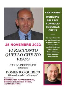 Domenico Quirico, il noto giornalista de “La Stampa”, sarà a Cantarana il prossimo 25 novembre per un incontro pubblico. Intervistato da Carlo Pertusati, potrà raccontare le proprie esperienze di corrispondente di guerra. La riunione si terrà in municipio, nella sala consigliare, con inizio alle ore 21. L’iniziativa è frutto di una cooperazione tra la Biblioteca “Ezio Pavia” di Cantarana, la Biblioteca di Dusino San Michele e il gruppo “Villafranca Domani”, con la collaborazione del Comune di Cantarana.