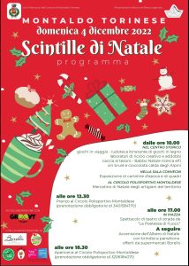 A Montaldo Torinese il 4 dicembre 2022 si terrà Scintille di Natale, una manifestazione per famiglie dove grandi e piccini potranno entrare a pieno nello spirito del Natale. Le strade di Montaldo saranno una succursale del paese di Babbo Natale. Grazie ad una coinvolgente Caccia al Tesoro i più piccoli potranno diventare Elfi aiutanti di Babbo Natale con giochi, laboratori, attività e regali.  Ci si potrà divertire nella Via dei Giochi grazie alla ludoteca itinerante Giochi in Viaggio. A contorno di questa gioiosa iniziativa ci saranno mercatino artigianale, mercatino dell’antiquariato, vin brulè e cioccolata a cura del Gruppo Alpini Montaldese, esposizione di quadri e cartoline d’epoca, pranzo e apericena al Circolo Polisportivo Montaldese e tanto altro. Alle ore 17 in piazza si terrà lo spettacolo di teatro di strada dal titolo “Poesie di fuoco gitane” de La poetessa di fuoco, a seguire accensione dell’Albero di Natale, auguri, brindisi e panettone offerto da Supermercati Borello.