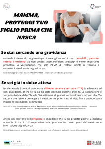 “Mamma proteggi tuo figlio prima che nasca”. E’ un appello/suggerimento che la struttura del Sisp lancia a tutte le donne che stanno cercando una gravidanza e a quelle che sono in attesa. Nel primo caso si chiede alla donna di controllare insieme al proprio ginecologo di avere gli anticorpi contro morbillo, rosolia e varicella. “Se non si dovesse avere sufficienti anticorpi – spiega il dott. Pierfederico Torchio, direttore del Servizio di Igiene e sanità pubblica (Sisp) – è molto importante prenotare la vaccinazione ma solo prima di restare incinta. Il vaccino è infatti controindicato in gravidanza. Nel si è già in dolce attesa è fondamentale la vaccinazione anti-difterite, tetano e pertosse (DTP). “Questa – prosegue il dott. Torchio – è da effettuarsi ad ogni gravidanza, anche se la mamma è già stata vaccinata in precedenza. La vaccinazione è somministrabile dalla 27esima alla 36esima settimana di gestazione, idealmente intorno alla 28esima settimana e serve a proteggere il nascituro nei primi mesi di vita, fino a quando potrà iniziare le vaccinazioni dell’infanzia”. Anche nei confronti dell’influenza è importante che la neomamma sia protetta poiché la malattia aumenta il rischio di: ospedalizzazione, prematurità, basso peso del nascituro e interruzioni di gravidanza.