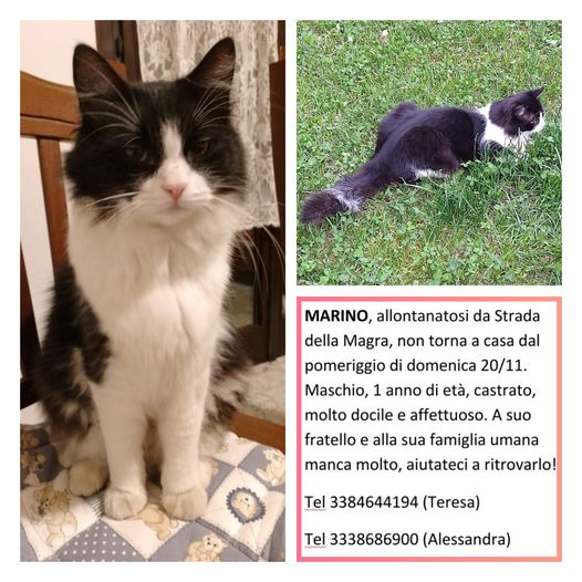 Chiarimento per non dare luogo ad ulteriori equivoci: MARINO è il nome del gatto, non il luogo da cui è scomparso. Il mio gatto si è allontanato dal quartiere BARCA, zona Nord di TORINO (come già indicato nel post alla prima pubblicazione). AGGIORNAMENTO 28/11 Avvistato ieri sera all’incrocio tra strada della Magra, via Vittime di Bologna e via Anglesio, dove poi si è rintanato in un orto. I due ragazzi che ci hanno avvisato l’hanno seguito dalla strada interna di strada della Magra, quella che parte da via Damiano Chiesa e passa dietro la scuola dell’infanzia, ma quando siamo arrivati sul posto non c’era più o si era nascosto e non ha risposto ai richiami e al rumore delle crocchette.Chiedo gentilmente, soprattutto a chi abita in quella parte del quartiere, di avvisarci in caso di ulteriori avvistamenti. Grazie!TORINO NORD, zona BARCA.Il nostro gatto manca ormai da 4 giorni, si è allontanato domenica 20/11 da Strada della Magra nel pomeriggio e non ha più fatto ritorno. È sempre stato abituato ad andare e venire da casa, ma è sempre ritornato in serata.L’abbiamo cercato dalla prima notte in cui non è rientrato, abbiamo messo volantini nel quartiere, ma a tutt’oggi nessuna segnalazione.Si capisce che è domestico, pur non avendo collarini, in quanto ben tenuto, castrato e abituato al contatto umano, ma se qualcuno l’avesse preso, pensando ad un abbandono, sappia che non è così. Manca molto a suo fratello, che passa le giornate ad aspettarlo, e anche alla sua famiglia umana. Se qualcuno lo avvistasse, è pregato di contattare i seguenti numeri: Teresa 3384644194Alessandra 3338686900