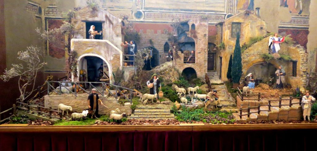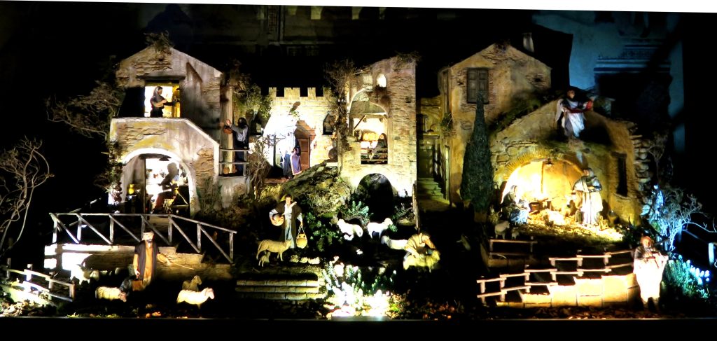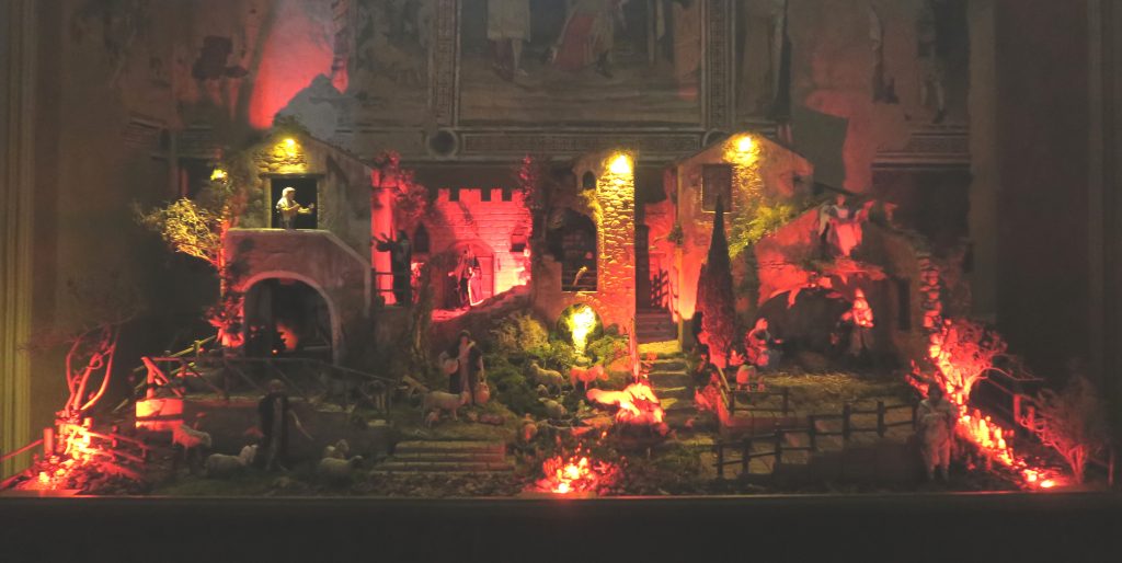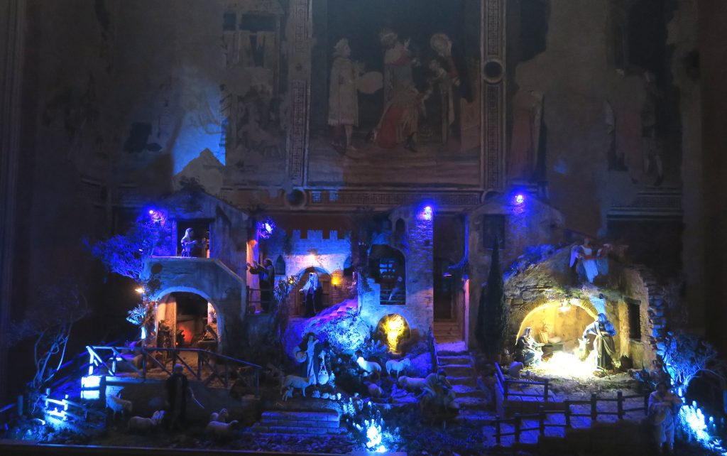 Siamo già a metà della seconda settimana di Avvento. Il Natale si avvicina a grandi passi. Parliamo del Natale di Gesù, perché quello del panettone, dei profumi di marca, delle mutande rosse con il farfallino, dei regali sofisticati, delle luci fantasmagoriche, insomma il Natale dei supermercati, imperversa già da tempo, ed è destinato ad afflosciarsi proprio al sopraggiungere del Natale vero. Gli amanti di quest’ultimo, siano essi persone, famiglie o parrocchie, sono già indaffarati nel preparare il presepio. Il Duomo di Chieri non è da meno: il suo presepio è già pronto (perché deve accompagnare l’attesa operativa del Signore che viene) e sarà inaugurato venerdì 8 dicembre, giorno della festa dell’Immacolata Concezione. E’ pronto anche se manca dell’essenziale, che vi comparirà la notte di Natale: parliamo, evidentemente, dell’immagine di Gesù Bambino. Si tratta di un presepio nuovo perché quest’anno Pinuccio ha eccezionalmente ceduto il compito della sua preparazione ad Emilio Parente, che da anni costruisce artistici presepi per la chiesa di San Luigi Gonzaga e non solo. Anzi, su richiesta del parroco don Marco, Emilio ha tirato fuori dal magazzino, e rimontato in Duomo, sia pure modificandolo in alcune parti, proprio il presepio costruito nel 2020 per quella chiesa. Nuova è anche la sistemazione del presepio di quest’anno: nella cappella dei Santi Lorenzo e Martino (o cappella Tabussi), che si presta perfettamente allo scopo, visto che vi sopravvivono alcuni particolari di una Natività che vi era affrescata e che è andata perduta e tuttora sulla parete di fondo vi compare la scena dell’Adorazione dei Magi, opera quattrocentesca della scuola di Giacomo Jaquerio. Dal punto di vista stilistico, il presepio costruito da Emilio Parente, negli scorci che crea e negli edifici che lo caratterizzano, si può definire popolare tradizionale. Anche i personaggi sono quelli tradizionali. Ricco è il complesso delle luci, grazie al cui gioco si alternano quattro distinte fasi della giornata: il tramonto, la notte, l’alba e il giorno. Un sintetico microcosmo, capace di ricostruire l’atmosfera e la magia del Natale di sempre e di offrire spunti di riflessione per quello dell’oggi.