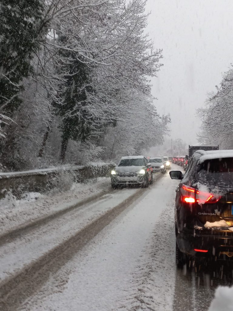 La prima importante nevicata della stagione mette K.O. la viabilità collinare. Lunghe code di auto a velocità (quasi) zero su Strada del Traforo del Pino, in particolare prima e dopo la galleria. Al momento, molti disagi ma nessun incidente (Foto di Pierangelo Cauda)