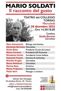 In occasione del sessantacinquesimo anniversario della trasmissione RAI “Alla ricerca dei cibi genuini, viaggio nella valle del Po”, primo reportage enogastronomica italiano, vero documento d’importanza antropologica, si ri-affronta, con taglio multidisciplinare, il tema della narrazione del cibo, della ristorazione e del vino. Mario Soldati fu un formidabile antesignano, interprete dell’identità nazionale che utilizzò come chiave di lettura per far conoscere l’Italia agli italiani. Oggi il racconto del gusto è divenuto strumento di comunicazione, informazione, business e cultura. In questo convegno verranno analizzati i mezzi, le strategie e i protagonisti; partendo dalle origini per comprendere il presente e il futuro di uno scenario complesso e affascinante, sorprendente e competitivo. PERCHE’ MARIO SOLDATI? Lo scrittore, Torino 1906, Tellaro 1999, merita di essere considerato il primo vero capostipite del racconto del vino del nostro paese. Soldati non fu soltanto uno “scrittore di genere” fu invece una figura culturale poliedrica e sorprendente: autore di libri di successo, giornalista, regista televisivo e cinematografico. Ecclettico e curioso, colto ed elegante, fu una delle migliori icone di un panorama intellettuale che non sempre lo accolse a braccia aperte. In suo onore Mara Antonaccio e Guido Barosio hanno fondato nel 2020 l’Associazione Culturale Mario Soldati. Un modo per rendere “contemporaneo” chi seppe anticipare i tempi e gli stili.