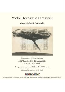 “Vortici, tornado e altre storie disegni di Claudia Campanella”, mostra personale di Claudia Campanella (Genova, 1962), a cura di Marco Gennaro, sarà ospitata negli spazi della Libreria “Borgopò” di Via Ornato 10 dal 17 dicembre 2022 al 2 gennaio 2023.