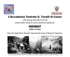 26 gennaio – Teatro Toselli – spettacolo dell’Accademia Teatrale Toselli, ore 21, “Heimat. Oltre il nome”