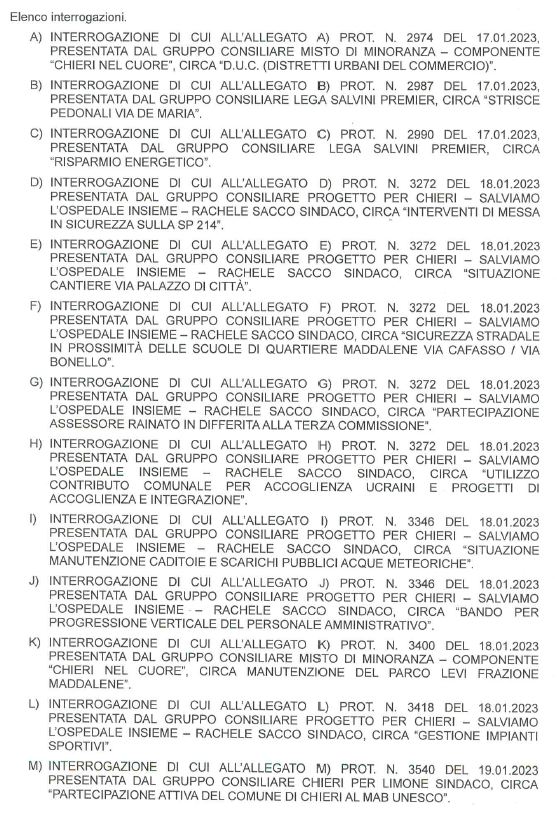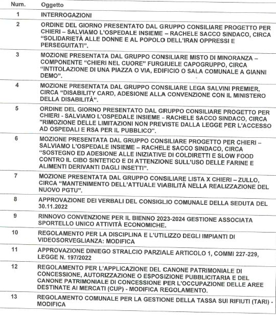 Chieri. Consiglio Comunale giovedì 26 e venerdì 27 gennaio