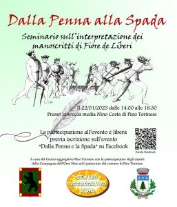 Domenica 22 gennaio dalle 14.00 alle 18.30 presso la scuola media Nino Costa in Piazza del Municipio. L’iniziativa, a cura del Centro Aggregativo di Pino Torinese, è volta a illustrare alcuni aspetti storici e sportivi riguardanti la scherma storica, con la partecipazione di istruttori ed esperti di scherma storica della Compagnia dell’Orso Nero che illustreranno le varie discipline che la compongono, per divulgare e promuovere uno sport oggi forse poco conosciuto. Un viaggio dal medioevo ad oggi per meglio comprendere le origini e l’evoluzione di questa nobile disciplina attraverso un momento teorico aperto a chiunque voglia partecipare e una seconda parte pratica destinata esclusivamente agli atleti.