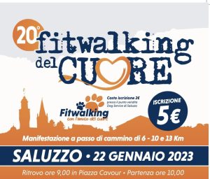 Domenica 22 gennaio torna a Saluzzo la camminata solidale Fitwalking del Cuore con l’obiettivo di sostenere il volontariato, le realtà associative scolastiche, parrocchiali e sportive del territorio. Il ritrovo è previsto per le ore 9:00 in Piazza Cavour mentre la partenza alle 10:00. Il costo d’iscrizione è di 5 euro e la vendita dei pettorali è gestita dalle associazioni attraverso l’attivazione di punti d’iscrizione sui social e sul sito www.scuolacamminosaluzzo.it o con la vendita diretta. È possibile iscrivere anche gli amici a quattro zampe per i quali sarà necessario acquistare il pettorale al prezzo di 2 euro presso il Dog Service di Saluzzo in Via Spielberg 104 oppure direttamente domenica 22 gennaio prima della partenza. Quanto raccolto dalle iscrizioni è devoluto a sostegno dei progetti presentati da associazioni e gruppi scolastici, sportivi e di volontariato che prendono parte alla raccolta iscrizioni in proporzione al numero degli iscritti.