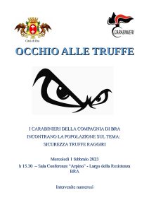 Occhio alle truffe! È l’avvertimento lanciato con regolarità dalle Forze dell’ordine per mettere in guardia le persone, soprattutto gli anziani, contro un fenomeno sempre molto diffuso. Per istruire la popolazione sugli accorgimenti da adottare per evitare truffe e raggiri, anche quest’anno il Comune di Bra e i militari della locale Compagnia Carabinieri organizzano un incontro pubblico che si terrà mercoledì 1 febbraio 2023 alle 15,30 nella sala conferenze del centro polifunzionale “Giovanni Arpino”, in largo della Resistenza. L’accesso è libero senza prenotazione e tutta la popolazione è invitata a intervenire. (rb)
