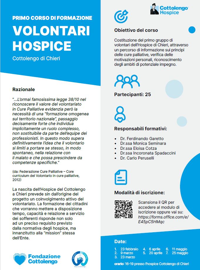 Il Cottolengo Hospice di Chieri organizza il primo corso di formazione per i volontari che intendono prestare servizio nella casa. L’opera, inaugurata il 2 settembre 2022 ed entrata in servizio il 17 ottobre, fin dall’origine del progetto ha previsto un coinvolgimento attivo del volontariato, in particolare del territorio chierese. La formazione dei volontari che vorranno mettere tempo, competenze e relazioni a servizio delle persone sofferenti risponde non solo ad un preciso requisito previsto dalla normativa sugli hospice, ma prima di tutto alla mission della Piccola Casa della Divina Provvidenza. Il corso si propone di costituire un primo gruppo di volontari attraverso un percorso di informazione sui princìpi delle Cure palliative, di verifica delle motivazioni personali e di riconoscimento degli ambiti di potenziale impegno. Il percorso inizierà il prossimo giovedì 23 febbraio 2023 e proseguirà il 9 e 23 marzo, il 6 e 20 aprile, l’11 e 25 maggio dalle ore 16 alle ore 19 presso il Cottolengo Hospice di Chieri (via Cesare Balbo 16). I temi che saranno affrontanti durante il corso si trovano nella locandina in allegato. L’itinerario formativo è condotto dalla seguente équipe: Dr. Ferdinando Garetto, Dr.ssa Monica Seminara, Dr.ssa Eloisa Cotza, Dr.ssa Incoronata Spadaccini, Dr. Carlo Peruselli. È possibile iscriversi scansionando il Qr Code nella locandina in allegato fino ad esaurimento dei posti disponibili (25 partecipanti).