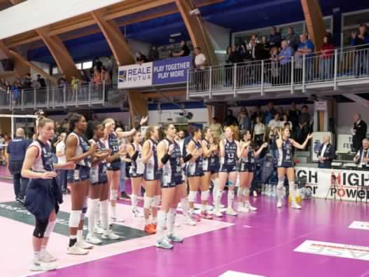 La cronaca Primo set – Si inizia con una fast di De Kruijf. Dopo una fase di punto a punto sul 5-5 Conegliano realizza il primo mini strappo con Haak (5-7). Le pantere mantengono un paio di lunghezze fino all’11-13 quando Chieri realizza i suoi primi punti break con un ace di Bosio e un muro di Mazzaro, ritrovando la parità a 13. Con due errori in attacco di Cazaute e Grobelba, un muro di De Kruijf dopo un’incredibile difesa di De Gennaro, e gli attacchi di Haak e Gray il vantaggio ospite raggiunge i 5 punti (13-18). Cazaute ferma la striscia ospite (14-18), quindi su servizio di Grobelna le biancoblù tornano a contatto (19-20, muro di Villani). A un nuovo allungo ospite (19-22) Chieri risponde con la solidità del muro-difesa. Le padrone di casa tornano in parità a 22 con Cazaute al termine di uno scambio spettacolare. Squarcini con un ace dà la prima palla set a Conegliano, ma poi serve sul nastro ed è 23-24. Chieri annulla il secondo set-point con Grobelna e si porta in vantaggio per la prima volta con un pallonetto di Cazaute (25-24). Haak mette a terra il 25-25, segue il 26-25 di Grobelna. Nello scambio successivo, prolungato e combattutissimo, i quattro tocchi consegnano il set alle ragazze di Bregoli (27-25).