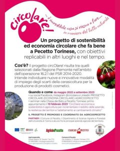 Il 10 febbraio nella Chiesa dei Batù a Pecetto Torinese si terrà un convegno dal titolo “circOlare! economia e sostenibilità in agricoltura per incrementare il reddito delle aziende, la resilienza dei territori e l’adattamento ai cambiamenti climatici”. Interverranno al convegno Elena Comollo, co-fondatrice della Cooperativa Agricoopecetto, Giovanna Giacalone, Professoressa Associata – Dipartimento di Scienze Agrarie, Forestali e Alimentari (DISAFA), Cristina Portinaro, Creative Cosmetics, Davide Murgese, coordinatore delle attività del progetto, e Renato Filippa, Sindaco del Comune di Pecetto Torinese. Il seminario rientra tra le iniziative del progetto “circolare!” di cui il Comune di Pecetto è partner.