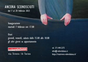 Volerelaluna, via Trivero 16, Torino. periodo mostra dal 7 al 28 febbraio 2023. Apertura: giovedì, venerdì, sabato 15.00 -18.00 – gli altri giorni su appuntamento – tel. 371.444.2275 – info@volerelaluna.it – https://viatrivero.volerelaluna.it