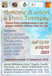 Sabato 11 febbraio alle ore 17.30 presso la Biblioteca Civica “Angelo Caselle” si terrà l’inaugurazione della mostra d’arte contemporanea 𝐀𝐫𝐦𝐨𝐧𝐢𝐞 𝐝𝐢 𝐜𝐨𝐥𝐨𝐫𝐢 𝐚 𝐏𝐢𝐧𝐨 𝐓𝐨𝐫𝐢𝐧𝐞𝐬𝐞, a cura del gruppo artistico chierese Liber Art Life. La mostra sarà visitabile dall’11 febbraio al 3 marzo 2023, presso la biblioteca di via Folis 9, dal lunedì al mercoledì ore 14,00-18,30 e dal giovedì al sabato ore 9,00-12,00 / 14,00-18,30. In esposizione le opere di Simone Beltramo, Attilio Collimedaglia, Michele Lovato, Aurora Lumare, Maria A. Monetta, Angela Rosso e Marisa Valle