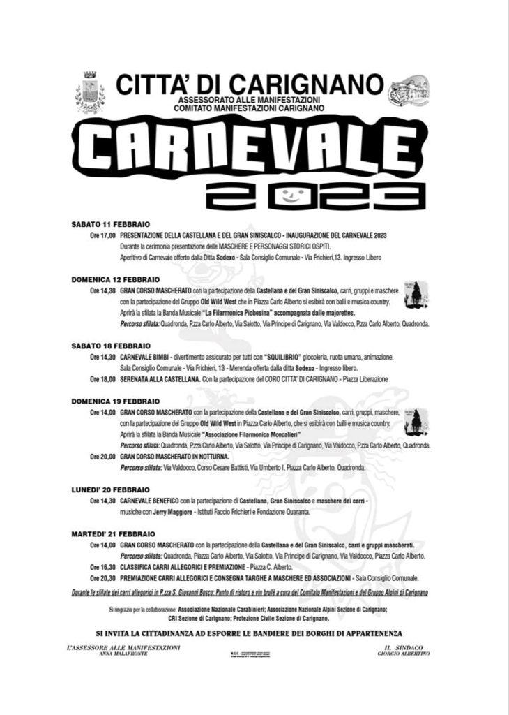 Tempo di Carnevale anche a Carignano. Ieri l’investitura della Castellana e del Gran Ciambellano (Loris Di Chiara e Michela Bauducco), con la partecipazione dell’assessore regionale Andrea Tronzano e dell’onorevole Daniela Ruffino; oggi domenica 12 dalle 14,30 il Gran Corso Mascherato con carri, gruppi e maschere, che sarà ripetuto domenica 19 (doppio appuntamento, alle 14,30 e alle 20) e martedì 21 febbraio. In mezzo, lunedì 20, alle 14,30 il Carnevale Benefico per gli Istituti Faccio Frichieri e Fondazione Quaranta.