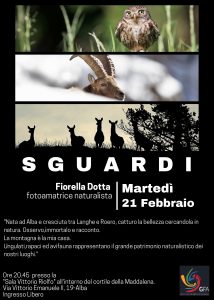 Martedì 21 febbraio alle ore 20.45 in sala “Vittorio Riolfo” nel Cortile della Maddalena (via Vittorio Emanuele II, 19) ad Alba, il Gruppo Fotografico Albese (Gfa) propone “Sguardi”,  serata ad ingresso libero aperta al pubblico (anche ai non soci), con la fotoamatrice naturalista Fiorella Dotta. Albese di nascita, Fiorella Dotta vive attualmente a Pollenzo, nel Roero. Autodidatta, ha iniziato a fotografare per passione otto anni fa. Adora la natura e la montagna e trascorre molto tempo a fotografare in Valle Stura al confine con la Francia. Fotografando gli animali ha iniziato piano, piano a conoscerli sempre meglio e a coltivare la passione per gli ungulati che insieme a rapaci ed avifauna rappresentano il grande patrimonio naturalistico piemontese. Negli ultimi anni ha fatto anche qualche viaggio fotografico che le ha aperto gli orizzonti sul mondo. Ha esposto le sue immagini in alcune mostre personali. Come brand ambassador di Swarovski Optik, ha parlato de “I segreti per realizzare un reportage nella natura”, all’interno di “We Nature” a maggio 2022 nel Parco San Bartolo di Pesaro. All’incontro in sala “Riolfo” porta in visione al pubblico circa un centinaio di foto. Durante la serata, il Gruppo presieduto da Roberto Magliano presenta al pubblico anche il corso di avvicinamento alla fotografia 2023. Dal 22 marzo, 9 serate di teoria e 3 uscite fotografiche, il mercoledì fino al 7 giugno.  Un corso rivolto a tutti gli appassionati desiderosi d’imparare a sfruttare al meglio la macchina fotografica.