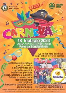 Sabato 18 febbraio dalle ore 15.00 alle ore 18.00 presso la Palestra della Scuola Media torna la grande 𝐟𝐞𝐬𝐭𝐚 𝐝𝐢 𝐂𝐚𝐫𝐧𝐞𝐯𝐚𝐥𝐞 per tutti i bambini! Uno spettacolo interattivo con giochi, musica e divertimento per grandi e piccini proposto da Comune di Pino Torinese e Pro Loco di Pino Torinese in collaborazione con i ragazzi dell’Oratorio.
