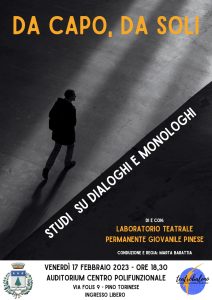 Alle 18,30 di venerdì 17 febbraio nell’Auditorium di Pino Torinese in via Folis 9 presso il Centro Polifunzionale il Laboratorio Teatrale Permanente Giovanile Pinese presenterà “Studi su dialoghi e monologhi”.