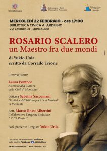 Il pomeriggio di mercoledì 22 febbraio si aprirà nella cornice della biblioteca civica “A. Arduino” di Moncalieri – in via Cavour, 31 – dove alle 17 sarà proiettato il docufilm Rosario Scalero: un Maestro tra due Mondi, prodotto dall’Istituto per i Beni Musicali in Piemonte.