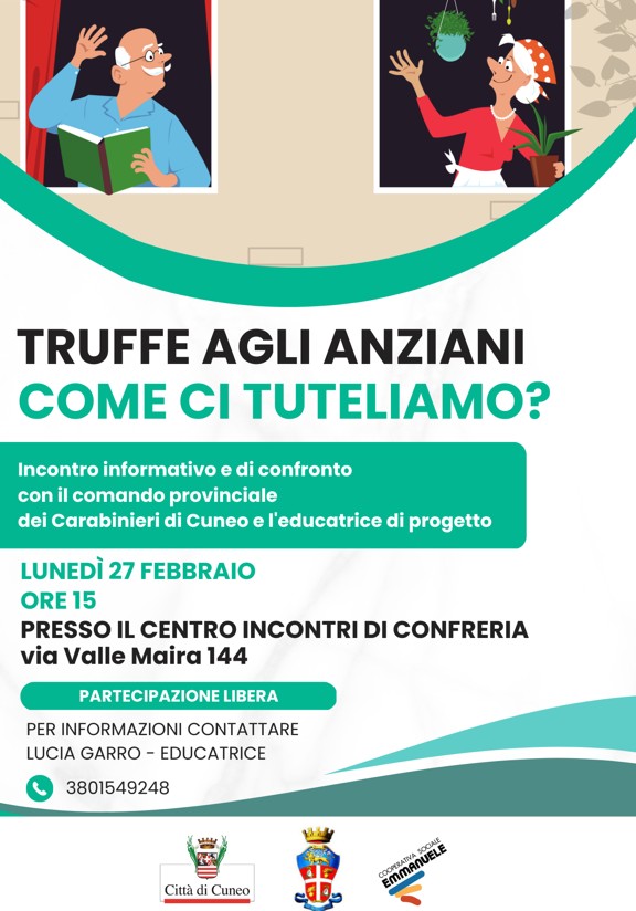 Lunedì 27 febbraio alle ore 15 presso il centro anziani di Confreria in via Valle Maira 144 avrà luogo il primo incontro sul tema delle truffe agli anziani. Gli incontri sono promossi dal Comune di Cuneo (settore socio educativo), all’interno del progetto “Prevenzione e contrasto delle truffe agli anziani” in collaborazione con il Comando provinciale dei Carabinieri di Cuneo e la cooperativa sociale Emmanuele. Il progetto ha lo scopo di fornire alcune indicazioni utili per tutelarsi al meglio di fronte alle truffe, attraverso differenti modalità. Durante l’incontro i carabinieri presenteranno le truffe più frequenti e attuali e le strategie attraverso le quali le persone anziane possono tutelarsi e denunciare. Insieme alle forze dell’ordine, all’incontro sarà presente anche un’educatrice della cooperativa Emmanuele, che accompagnerà gli anziani nel riconoscere l’importanza di avere intorno una rete di fiducia a cui rivolgersi e a cui chiedere aiuto. Spesso infatti le persone vittime di truffe faticano ad esporsi e a denunciare: per questo motivo i momenti informativi saranno anche occasione di scambio e confronto tra i partecipanti.
