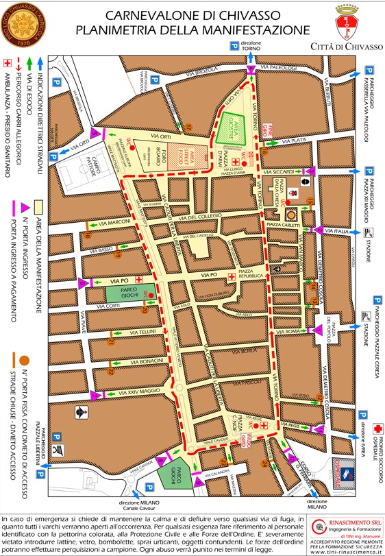 Sono state predisposte dieci aree parcheggio gratuite, 24 vie di esodo, 4 postazioni sanitarie, 11 porte d’ingresso a pagamento, 8 euro per ultra dodicenni e non residenti. Dopo il grande afflusso di gente alla sfilata di domenica scorsa, Chivasso è pronta ad accogliere il pubblico del Carnevalone, nella giornata del gran finale del 26 febbraio. Dalle ore 10, saranno presentate maschere e gruppi ospiti, allo stesso orario il Foro Boario ospiterà gli stand dello street food, mentre alle ore 11 gruppi musicali e folkloristici accompagneranno la passeggiata dei personaggi in costumi carnevaleschi nel centro storico.