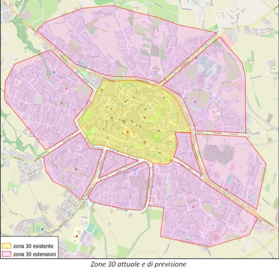 Particolarmente curato il tema Zona 30. “In definitiva l’attuale zona 30, coincidente con l’area centrale, viene estesa in pratica sino ai limiti dell’edificato, con l’esclusione delle strade di tipo E ed EF1, oltre ad alcuni tratti di radiali di categoria EF2. Risulta inserito in zona 30 anche il lato sud di piazza Europa. All’interno delle zone 30 possono essere individuate le “zone residenziali”, cioè ambiti particolarmente moderati –le velocità possono qui essere ulteriormente ridotte- dai quali escludere le componenti di traffico non strettamente locali e nei quali l’intero spazio stradale è restituito all’uso condiviso tra i diversi utenti, motorizzati e non.” Da Zona 30 a Città 30 il passo non sarà breve. “L’attuazione della “città 30” può essere articolata in due fasi. Una prima fase, basata sulla sola installazione della segnaletica, si limita a estendere i nuovi limiti di velocità a tutte le zone previste dal Piano (con opportune ripetizioni della segnaletica per ricordare i nuovi limiti al conducente). La seconda fase è invece destinata rendere effettiva la moderazione dei comportamenti nelle zone o lungo gli assi che lo richiedono sulla base di specifici ‘piani particolareggiati’.”