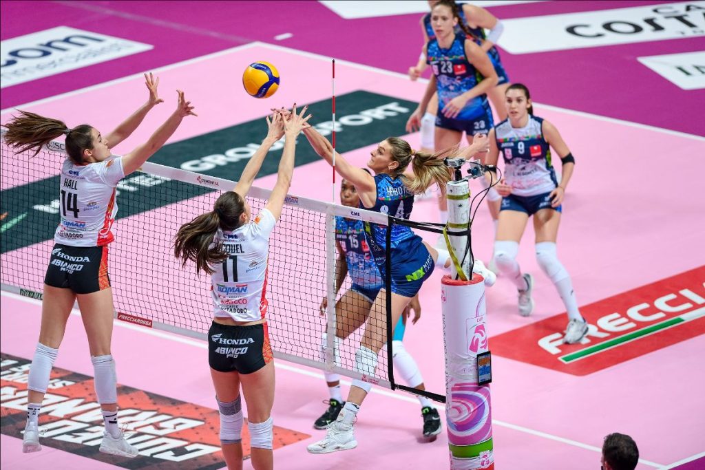 TERZO SET Per Firenze c’è Guiducci in cabina di regia dal via. Partenza in salita per la Cuneo Granda S.Bernardo, poi un ace di Kuznetsova propiziato dal nastro, un attacco di Szakmáry non difeso dalla seconda linea toscana e un muro a uno della stessa schiacciatrice ungherese su Sylves per il break biancorosso (6-4). Gicquel gioca bene sulle mani del muro toscano, Szakmáry legge il tocco di Guiducci e sul 10-6 Parisi chiama a colloquio le sue. La Cuneo Granda S.Bernardo non incanta ma resta avanti (14-11). Kuznetsova mura Nwakalor, poi Szakmáry risolve uno scambio prolungato con l’attacco che vale il 16-11. Herbots prova a avviare la rimonta ospite, ma Szakmáry dice no con l’ennesimo colpo di classe. Ancora la schiacciatrice toglie le castagne dal fuoco, poi Gicquel capitalizza al meglio una doppia grande difesa di Signorile e Caravello. Sul 22-17 siglato da Kuznetsova con un contrasto vinto a rete Parisi chiede time out. Altra difesa spettacolare, questa volta di Szakmáry, e ancora Gicquel con un attacco delizioso. Un errore in battuta chiude il set sul 25-18 a favore della Cuneo Granda S.Bernardo, che passa a condurre 2-1. Tabellino: 8 Szakmáry, 7 Gicquel, 5 Herbots