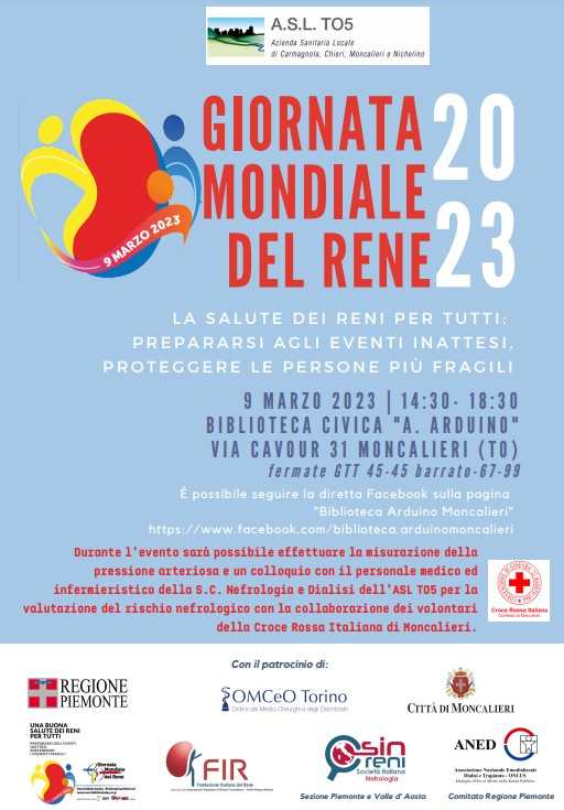 Libero accesso a colloquio nefrologico e misurazione della pressione arteriosa: preveniamo ipertensione e diabete, killers silenziosi per i reni. Porte aperte alla popolazione presso la Nefrologia dell’Asl TO5 durante la Giornata Mondiale del Rene del 9 marzo (Biblioteca A. Arduino – Moncalieri – ore 14.30)