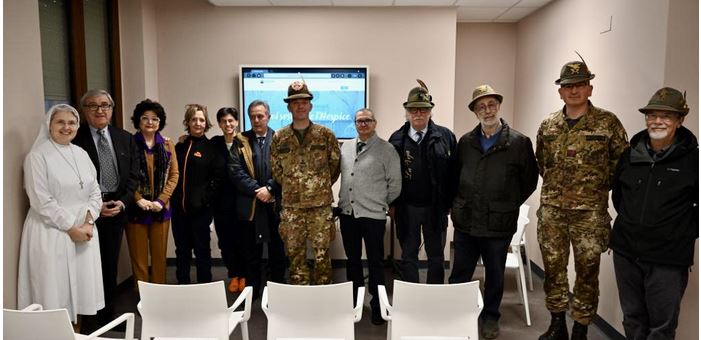 Si è svolta martedì 28 febbraio la visita del Generale Nicola Piasente e del Presidente della Sezione di Torino dell’Associazione Nazionale Alpini, Guido Vercellino, all’Hospice Cottolengo di Chieri, il centro per le cure palliative creato dalla Piccola Casa e dedicato alle persone colpite da malattie severe, che beneficerà di una sala di formazione per le équipes della struttura, allestita grazie alla donazione dei fondi raccolti a dicembre da diversi Gruppi dell’ANA nel corso della tournée natalizia della Fanfara della Brigata Alpina Taurinense che ha toccato Savigliano, Rivoli, Forno Canavese, Bardonecchia, Trecate, Bra e Genova. L’iniziativa benefica delle penne nere in armi e in congedo – che si iscrive nel perimetro dei forti legami storici tra il Corpo e il territorio con le sue comunità – contribuirà al funzionamento di uno spazio multimediale con strumenti informatici di qualità a disposizione di tutti gli operatori dell’hospice, fornendo la continuità formativa del personale che si prende cura degli ospiti e dei loro familiari. La sala consentirà tra l’altro la partecipazione del personale a corsi a distanza, senza doversi assentare dal posto di servizio, facilitando così la presenza vicino ai malati.