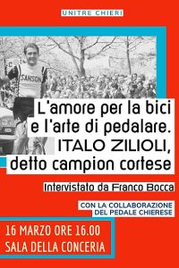 Giovedì 16 marzo alle ore 16.00 l’ex ciclista Italo Zilioli incontra gli iscritti di Unitre Chieri nella Sala della Conceria