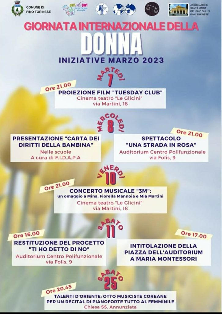 A Pino Torinese, per l’8 Marzo, un programma ricco di eventi in onore delle donne. Anche l ‘intitolazione della piazza antistante il centro polifunzionale di Pino su suggerimento della Fidapa, a Maria Montessori.