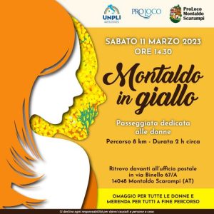 L’8 marzo si festeggia la Giornata internazionale dei diritti della donna ed è anche il momento per organizzare qualcosa insieme alle amiche. Nell’ambito delle iniziative nel comune di Montaldo Scarampi in occasione della festa della donna, la pro loco ha organizzato un evento del tutto innovativo: “Montaldo in giallo -passeggiata dedicata alle donne”, in programma sabato 11 marzo. La pro loco informa: “ sono le nostre solite camminate sul nostro territorio, con alcune salite e discese, asfalto e sterrato. I Km sono approssimativi, ma mai meno di 8. Andiamo ognuno con il proprio passo e a tappe ci aspettiamo”. Con l’arrivo della bella stagione, la pro loco organizza tante attività per fare conoscere le bellezze del territorio. Guide appassionate ed esperte vi accompagneranno alla scoperta della natura e della storia per trascorrere piacevoli giornate in compagnia, all’insegna del benessere e della condivisione. Il percorso si snoda tra dolci colline, attraverso prati, vigneti e boschi per scoprire questo territorio. Durante il primo pomeriggio si potranno ammirare le fioriture del sottobosco e la primavera che sta arrivando, in una natura ricca di storia e bellezza. La camminata dedicata alle donne per scoprire il paese ‘in rosa’, ma naturalmente aperta anche ad amici, compagni, padri e figli che vogliono festeggiare con loro. Occasioni utili e di estrema importanza per sottolineare la vicinanza del progetto della pro loco che lo porta avanti da qualche tempo e a tutti coloro che decidono di mettersi in cammino. A Montaldo riprende dunque la bella iniziativa delle camminate con uno sfarfallio di scarpe da ginnastica, questa volta in occasione della Giornata internazionale della donna. Il raduno dei partecipanti è previsto davanti all’ufficio postale, luogo dove iniza la passeggiata, Il via alle ore 14,30. Una passeggiata dedicata alle Donne! Sì, Donne con la D maiuscola! Vi dice niente Santa Caterina da Siena? O Violante di Baviera? O ancora Pia de’ Tolomei? Donne che hanno fatto la storia; Donne i cui destini si sono intrecciati con i potenti del passato; e Donne di cui magari non si sa neppure il nome, ma che hanno lasciato un segno. Un momento dedicato alla creatura più bella che c’è in natura: d’altronde Dio fece primo Adamo e poi Eva! In occasione della festa della donna, una passeggiata in rosa per chiacchierare e condividere un momento insieme in natura. Una passeggiata lenta per ascoltare il nostro corpo e coccolarlo. Un momento per staccare la spina e ricaricarsi, un tempo tutto per noi, sempre così indaffarate e piene di impegni. Una passeggiata dedicata alle donne, perchè ogni giorno sia un giorno senza discriminazione e senza violenza. Non serve essere allenati per prendere parte alla camminata delle donne. E’ un’escursione panoramica adatta a tutti, in un weekend dedicato alle donne, per la festa che celebra l’universo femminile. La storia la scrivono gli uomini… ma qualche volta no e quindi si celebrano le donne del passato e del presente. Il percorso è di circa 8 Km. per circa 2 ore di cammino. A fine percorso tutte le donne riceveranno un omaggio e si gusterà tutti insieme una buonissima merenda; questo indubbiamente renderà la giornata ancora più piacevole.