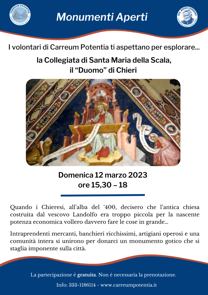 Con la rassegna “Monumenti Aperti 2023” dell’associazione culturale Carreum Potentia siviaggia tra l’arte e la storia della città di Chieri. Tappa di questo mese sarà la Collegiata di Santa Maria della Scala, conosciuta dai cittadini come il Duomo. I volontari di Carreum vi aspettano per esplorare questo maestoso monumento domenica 12 marzo, ore 15,30-18. L’evento è gratuito e non c’è bisogno di prenotarsi. Per ulteriori informazioni: +39 388 356 25 72 -info@carreumpotentia.it. Il prossimo appuntamento si terrà domenica 16 aprile, per rimanere sempre aggiornati visitate il calendario delle prossime attività sul sito www.carreumpotentia.it