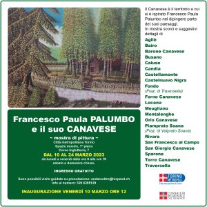 Dal 10 al 24 marzo lo spazio mostre della Città metropolitana di Torino (corso Inghilterra 7) ospita la mostra “Francesco Paula Palumbo e il suo Canavese”. Torinese d’adozione, il Maestro Palumbo nasce a Tarando il 14 marzo del 1917 e muore a Torino il 22 ottobre 2008. Una ricca selezione di sue opere ritornano, dopo una lunga assenza, in mostra a Torino. È infatti dal 1986 che le opere pittoriche di Francesco Paula Palumbo non vengono più esposte nel capoluogo piemontese, la città in cui visse fin dal 1921, quando all’età di quattro anni si trasferì con la famiglia per motivi artistici e lavorativi. Si tratta della quindicesima esposizione in meno di quattro anni, una sorta di “Grand Tour” piemontese iniziato a Cuneo nel maggio 2019 e proseguito a Rivarolo nel 2021 e a Rivara nel 2022. La mostra, patrocinata dalla Città metropolitana di Torino e dal Consiglio Regionale del Piemonte, inaugura venerdì 10 marzo alle ore 12. Oltre a riscoprire e a far conoscere al vasto pubblico un fecondo passato di iniziative artistiche presenti nel territorio canavesano, questa esposizione ha consentito il ritrovamento di altre opere del Maestro, appartenenti a collezioni private, che si ispirano per esempio alla zona di Rivara e dintorni. Il Canavese è il territorio a cui si è ispirato Francesco Paula Palumbo nel dipingere parte dei suoi paesaggi. In mostra scorci e suggestivi dettagli di Agliè, Bairo, Barone Canavese, Busano, Caluso, Candia, Castellamonte, Castelnuovo Nigra, Fondo (Fraz. di Traversella), Forno Canavese, Locana, Meugliano, Montalenghe, Orio Canavese, Piamprato Soana (Fraz. di Valprato Soana), Rivara, San Francesco al Campo, San Giorgio Canavese, Sparone, Torre Canavese e Traversella.