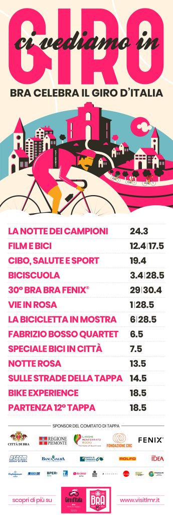 A rendere possibile questo ricco calendario di iniziative il contributo degli sponsor del Comitato di Tappa, ovvero Regione Piemonte, Atl Langhe, Monferrato, Roero, Fondazione Crc, Fenix, Ascom Bra, Banca d’Alba, Banca di Cherasco, Rolfo, Rivista Idea, Confartigianato Cuneo, Banca Crs, Bper, Tesi Square, Bra Servizi, Selmi, Ascheri, Dicaf, Sac, Panathlon Bra.
