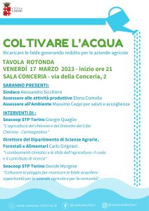 Venerdì 17 marzo, alle ore 21, presso la Sala Conceria (via Conceria, 2), a Chieri, si svolgerà l’incontro pubblico organizzato dall’amministrazione comunale dal titolo “Coltivare l’acqua. Ricaricare le falde generando reddito per le aziende agricole”. Spiega l’assessora alle Attività produttive e all’Agricoltura Elena COMOLLO: «Il Piemonte e l’intero Nord Ovest sta soffrendo una drammatica siccità che ci costringe a fare i conti con un’emergenza idrica molto preoccupante. Non possiamo illuderci di avere a che fare con un qualcosa di ‘congiunturale’ e di passeggero. Bisogna trovare soluzioni di natura strutturale e di medio e lungo termine. Nel dibattito pubblico si sente spesso invocare la realizzazione di nuovi “invasi”. Nel nostro territorio, tuttavia, il principale processo di approvvigionamento di acqua è legato alla ricarica delle acquee sotterranee. Per capire dove e come facilitare l’infiltrazione delle acque meteoriche per ricaricare le falde, così da rendere disponibile la risorsa idrica all’agricoltura quando ne ha più necessità, come amministrazione comunale abbiamo affidato al dottor Davide Murgese (Seacoop STP Torino), referente tecnico del Distretto del Cibo del Chierese e del Carmagnolese, l’incarico di redigere un apposito studio finalizzato a valutare le potenziali aree di infiltrazione delle acque meteoriche a favore della ricarica degli acquiferi utilizzati per usi irrigui. Il convegno sarà l’occasione per presentare gli esiti di questo studio, approfondendo le soluzioni specifiche che sono state individuate».