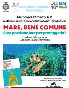 Mercoledì 22 marzo, in occasione della Giornata Mondiale dell’Acqua, Pino Torinese ospiterà un’importante iniziativa per riflettere, insieme al gruppo locale “Plastic Free”, sulle disastrose conseguenze dell’inquinamento da plastica nei nostri oceani. L’evento, dal titolo “Mare, bene Comune. Cosa possiamo fare per proteggerlo?”, si terrà presso l’Auditorium del Centro Polifunzionale di via Folis, 9 (piazza Maria Montessori) alle ore 21.