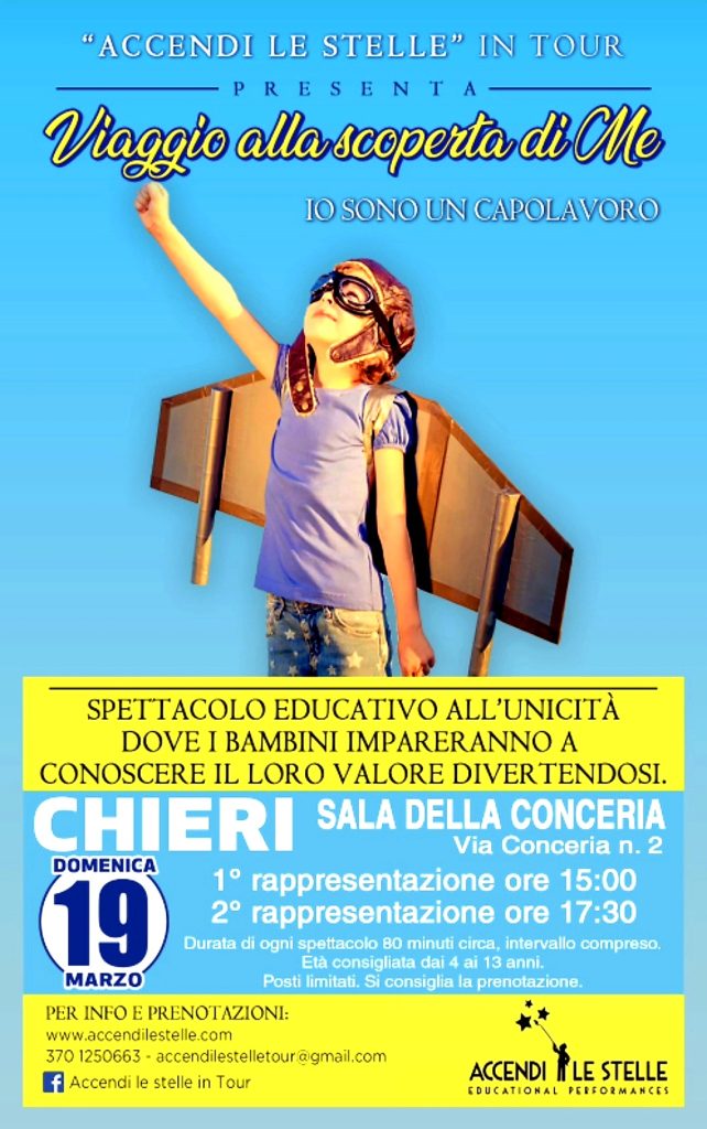 DOMENICA 19 MARZO A CHIERI La compagnia “Accendi Le Stelle ” presenterà: “VIAGGIO ALLA SCOPERTA DI ME – IO SONO UN CAPOLAVORO ” Uno Spettacolo UNICO e Divertente che rimarrà per sempre nel cuore dei bambini.❤