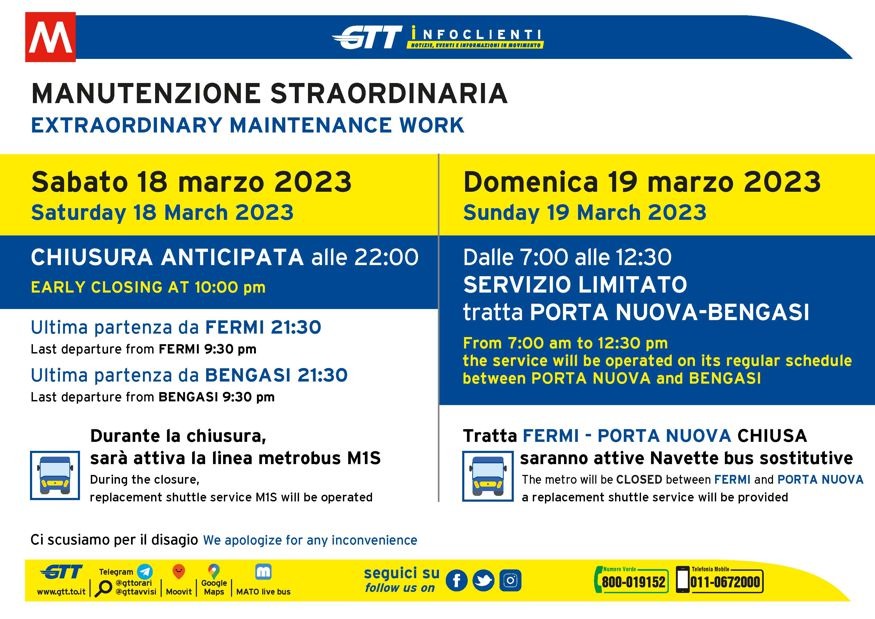 - Domenica 19 marzo, dalle ore 7.00 (inizio del servizio) alle ore 12.30, la metropolitana sarà attiva solo nella tratta Porta Nuova-Bengasi. Da Fermi a Porta Nuova saranno in servizio navette bus sostitutive. Entro le ore 12.30 la metropolitana tornerà a circolare regolarmente sull’intero percorso Fermi-Bengasi.