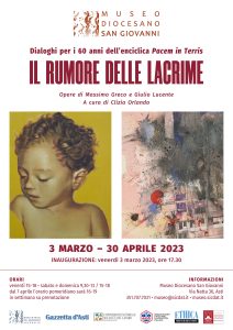 Presso il Museo Diocesano San Giovanni di Asti, via Natta 36, è aperta la mostra “IL RUMORE DELLE LACRIME. Opere di Massimo Greco e Giulio Lucente”, nell’ambito degli eventi celebrativi per il sessantesimo anniversario della pubblicazione dell’enciclica “Pacem in terris” di san Giovanni XXIII. Il percorso espositivo, realizzato in collaborazione con la Biblioteca del Seminario Vescovile di Asti, la Gazzetta d’Asti, la Pastorale Sociale e del Lavoro, Giustizia, Pace e Salvaguardia del Creato della Diocesi di Asti, ACLI Asti e Associazione Ethica, è curato da Clizia Orlando. La mostra sarà aperta al fino al 30 aprile 2023 con il seguente orario: fino al 2 aprile, venerdì 15-18, sabato e domenica 9.30-13 e 15-18; dal 3 aprile, venerdì 16-19, sabato e domenica 9.30-13 e 16-19, nei restanti giorni della settimana su prenotazione all’indirizzo museo@sicdat.it oppure al 351.707.7031. Possibilità di visite guidate su prenotazione.