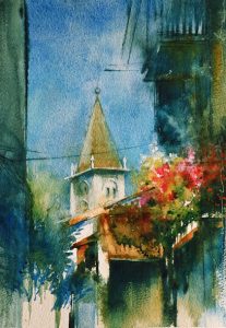 Fine disegnatrice e interprete sensibile della pittura di paesaggio, Ines Daniela Bertolino sa sfruttare magistralmente le potenzialità dell’acquerello, una tecnica difficile che va di pari passo con la sua versatilità ed immediatezza. Acqua e colore si fondono sulla bianca carta per dar vita ad un gioco meraviglioso e continuo di emozioni. Nelle opere di questa artista è sempre presente uno dei colori primari, il ”blu”, in tutte le sue sfumature, quelle intense e quelle più diluite. Impossibile rimanere indifferenti alla sua poetica, dove ogni elemento viene riportato con una straordinaria resa pittorica, come tra il colore del cielo e il verde della natura che paiono compenetrarsi in un magico idillio coloristico. Anche l’antica strada che conduce alla famosa piazza del Conte Rosso è inondata da un torrente blu che scende impetuoso fino a lambire il nostro sguardo. Oltre ai bellissimi acquerelli sono presenti in mostra vecchie e antiche lenzuola che l’artista ha preparato come supporto su cui utilizzare il colore acrilico diluito al massimo quasi fosse un’opera su carta. È il caso de “Il Lago”, baciato dalla luce lunare e da una miriade di stelle che pare evocare una poesia scritta da John Keats, il più grande poeta del Romanticismo inglese. Nella poetica di Keats il lato luminoso e quello oscuro esistono in un rapporto di stretta dipendenza, allo stesso modo accade quasi per magia nel bel dipinto di Ines Daniela Bertolino.