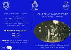 La Biblioteca Nazionale Universitaria di Torino, fondata 300 anni fa da Vittorio Amedeo II di Savoia, custode della biblioteca della Regina Margherita, è la sede appropriata per commemorare l’ultimo Re d’Italia, Umberto II, nipote della Regina Margherita, nel 40° della morte. Un ricordo dell’anniversario attraverso alcune testimonianze appartenenti alla Biblioteca Nazionale, al Centro Studi Piemontesi e a un archivio privato. Il minuto e significativo insieme, formato da libri, giornali e oggetti suggestivi che evocano momenti di vita pubblica e intima del sovrano, è visitabile dal lunedì al venerdì dalle 10 alle 16 dal 17 marzo al 30 aprile. Saranno organizzate visite guidate alla Biblioteca della Regina Margherita e all’esposizione dedicata a Umberto II il 17 marzo alle 11.00 e alle 13.00. Gradita la prenotazione a bu-to.eventi@cultura.gov.it