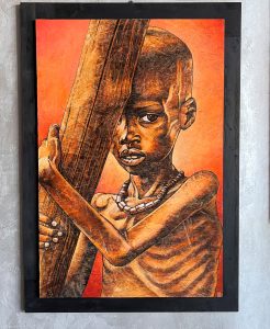 La tecnica utilizza materiali semplici e poveri: terre, carboncini, acrilico, e pannelli in legno di recupero capaci di conferire alle opere un particolare tratto materico e una “ferita aperta” sui volti rappresentati. Quadri-non-quadri che partendo da un materiale di scarto, raccontano di una fuga per la vita e di un Dio che non fa scarti!
