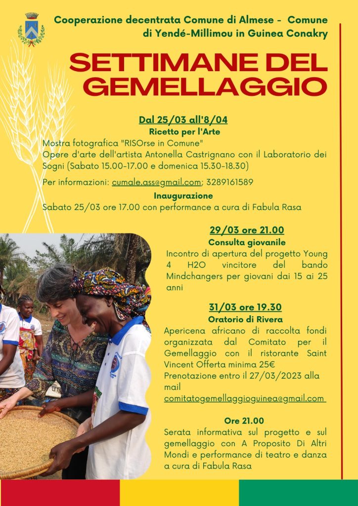 Il Comune di Almese in collaborazione con il Ricetto per l’Arte – Agorà della Valsusa -, la Consulta Giovani, la compagnia teatrale Fabula Rasa e A Proposito Di Altri Mondi Impresa Sociale dopo le iniziative realizzate nel programma degli eventi del Settembre Almesino, da il benvenuto alla primavera con un evento di grande importanza sociale, la settimana dedicata al gemellaggio Almese – Yendè Millimou Guinea Conarky nell’ambito del progetto “RISOrse in Comune”