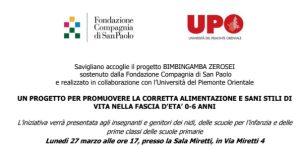 A Savigliano il progetto BIMBINGAMBA ZEROSEI sostenuto dalla Fondazione Compagnia di San Paolo e realizzato in collaborazione con l’Università del Piemonte Orientale, per promuovere la corretta alimentazione e sani stili di vita nella fascia di età 0-6 anni.