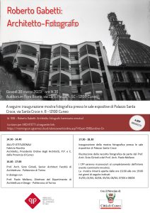 L’Ordine degli Architetti, Pianificatori, Paesaggisti e Conservatori della Provincia di Cuneo, con il Patrocinio del Comune di Cuneo e la collaborazione di CAMERA – Centro Italiano per la Fotografia – presenta a Cuneo un evento culturale con mostra fotografica aperta alla Città dal titolo “Roberto Gabetti: Architetto-Fotografo”.