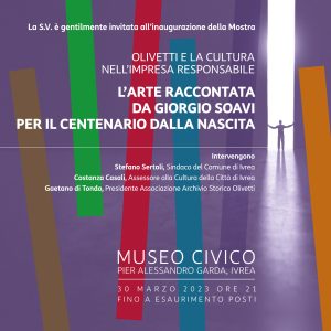 Dopo cento anni dalla nascita di Giorgio Soavi, la Città di Ivrea, in sinergia con l’Associazione Archivio Storico Olivetti, intende ricordarlo dedicandogli una mostra. Per l’occasione, il Museo Civico “P.A. Garda” effettuerà un’apertura serale il giorno 30 marzo 2023 alle ore 21, con l’inaugurazione della mostra “L’Arte raccontata da Giorgio Soavi per il centenario dalla nascita”. In anteprima assoluta, l’allestimento sarà rivoluzionario: un ologramma di Giorgio Soavi che parlerà con la sua voce al pubblico. Una vera e propria materializzazione in 3D. Una proposta sensoriale unica sia dal punto di vista tecnologico che emozionale, che potrà essere vissuta sino al 30 aprile 2023. La mostra proseguirà sino al 26 novembre 2023. Tale mostra consentirà di illuminare, per la prima volta, la figura poliedrica di Giorgio Soavi, scrittore che entra nel mondo Olivetti dall’età di 24 anni, prima nelle Edizioni di Comunità e poi, negli anni Cinquanta, nella società Olivetti come curatore di grandi progetti legati all’arte e all’editoria. Amico e frequentatore di riconosciuti artisti del secolo scorso, da Giacometti a Balthus, scopritore di giovani talenti nel campo dell’arte poi affermatisi anche grazie al suo istinto e intuito, da Folon a Pizzigoni, per Soavi la pittura è alimento che nutre la scrittura, impulso vitale che ci restituisce una ricchissima produzione da non critico d’arte, quale intendeva essere.