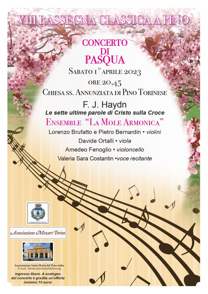 Ancora un appuntamento con la Grande Musica sempre nella Chiesa della SS Annunziata di Pino Torinese, sabato 1 aprile alle 20,45. Il consueto CONCERTO DI PASQUA con l’ENSEMBLE LA MOLE ARMONICA, della quale fa parte, tra gli altri musicisti, il nostro pinese, AMEDEO FENOGLIO, per meditare con LE ULTIME SETTE PAROLE DI CRISTO SULLA CROCE.