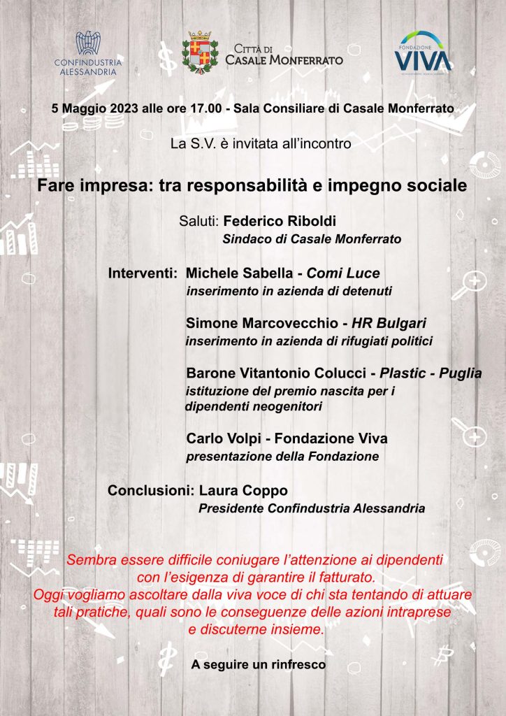 La Città di Casale Monferrato, in collaborazione con Confindustria Alessandria e la Fondazione VIVA, organizza l’incontro “Fare Impresa: tra responsabilità e impegno sociale” che si terrà nella Sala Consiliare del Comune, a Palazzo San Giorgio, venerdì 5 maggio alle ore 17.