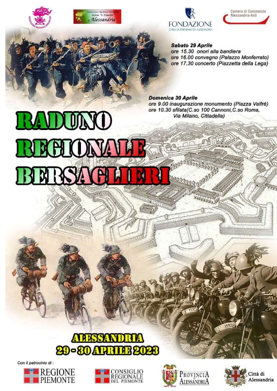 Il 29 e il 30 aprile 2023 Alessandria accoglierà il Raduno Regionale dei Bersaglieri, evento che porterà in città numerose “piume nere” per un evento fortemente voluto dagli iscritti della Sezione “E. Franchini” di Alessandria, con l’approvazione del Direttivo Regionale Bersaglieri, per celebrare le tante azioni messe in campo dal 2007, anno della ricostituzione della sezione alessandrina, a oggi.